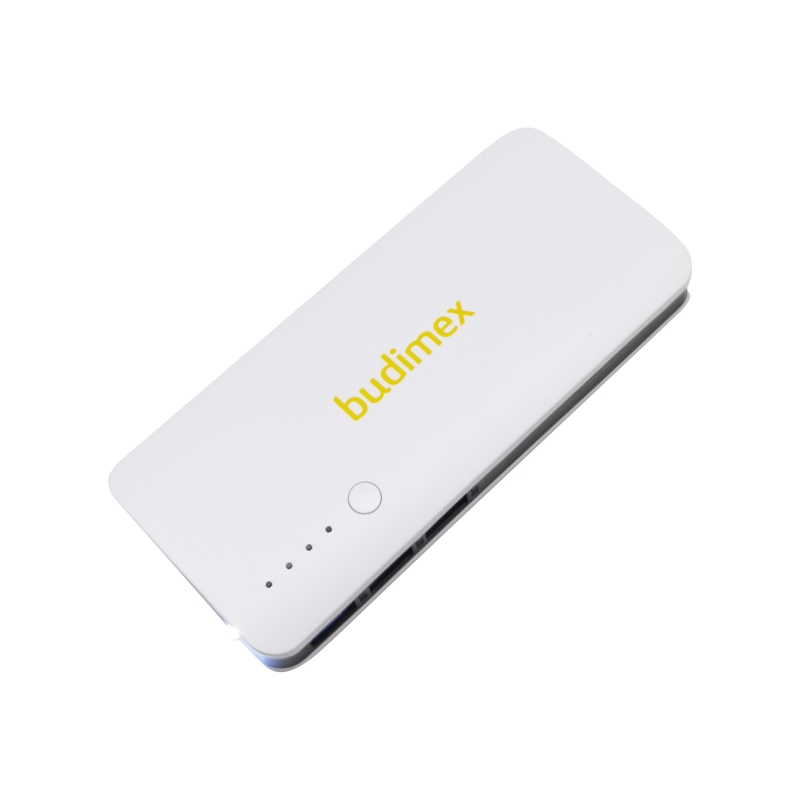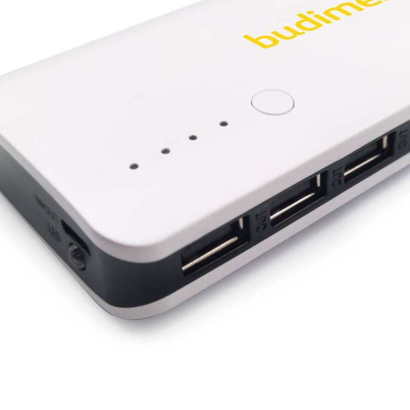 Power bank 10000 mAh, możliwość ładowania trzech urządzeń jednocześnie, 4 diody wskazujące poziom naładowania, 1 lampka LED, 3 wyjścia USB 5V/2.1A, wejście micro USB 5V/2.1A, kabel nie jest dołączony