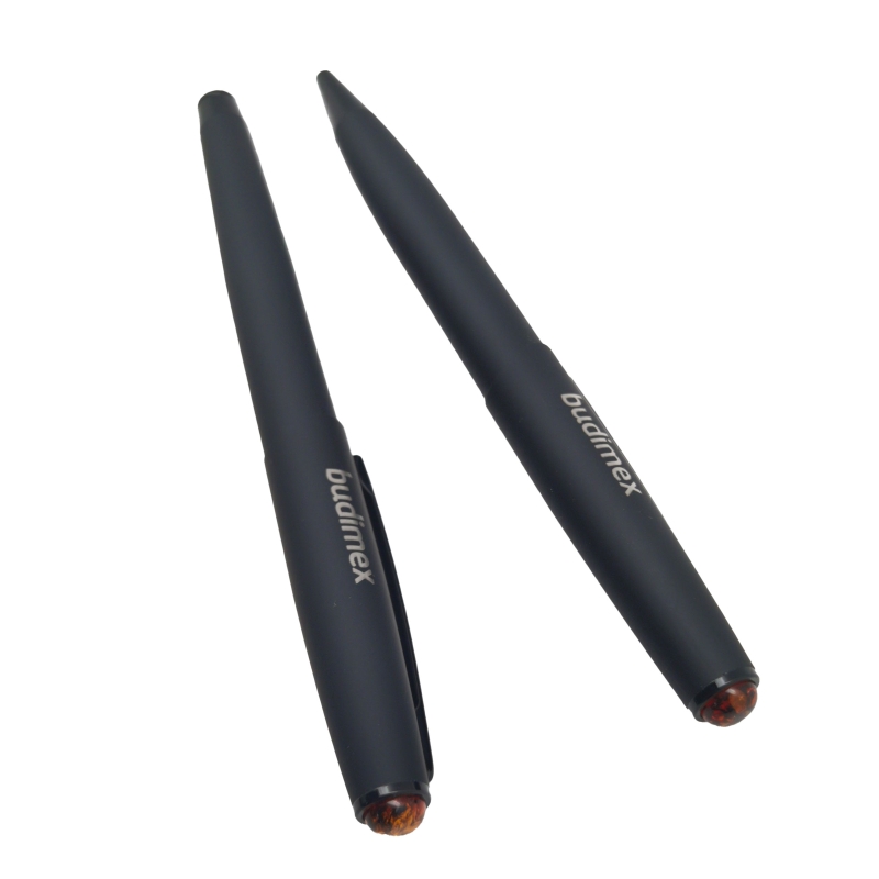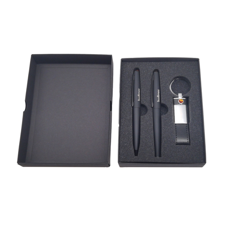 Zestaw składający się z eleganckiego pióra kulkowego i długopisu z niebieskim wkładem oraz wykończeniem Rubber Finish, a także breloka ze ekoskóry. Całość zapakowana w stylowe papierowe pudełko.