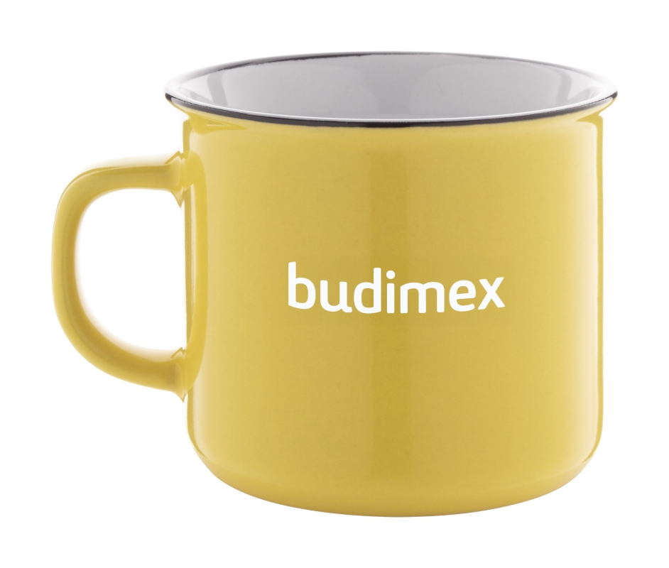 Ceramiczny kubek w stylu "vintage" z białym środkiem i czarną obramówką. Kolorowy z zewnątrz. 300 ml. W pudełku prezentowym.