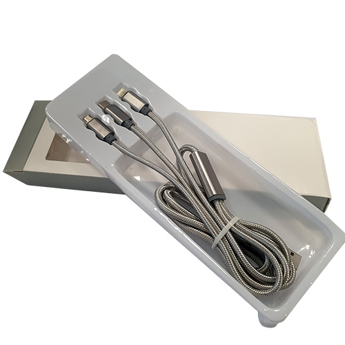 The TAUS 3-in-1 USB cable for charging various devices has three connectors: micro USB, Lightning (iPhone) and USB Type-C. The cable is fabric-coated and the USB connectors are made of metal. A practical gadget for every mobile device user.